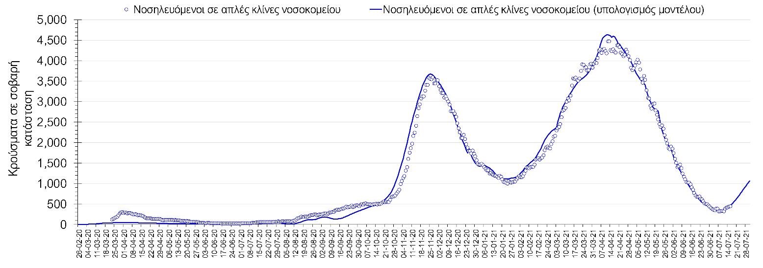 Σχήμα 2. Αριθμός κρουσμάτων σε σοβαρή κατάσταση (νοσηλευόμενοι σε απλές κλίνες) σύμφωνα με τα στοιχεία του ΕΟΔΥ και τις προβλέψεις της υπολογιστικής πλατφόρμας CORE.