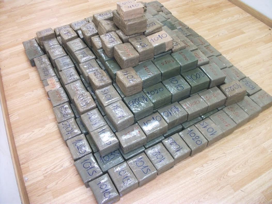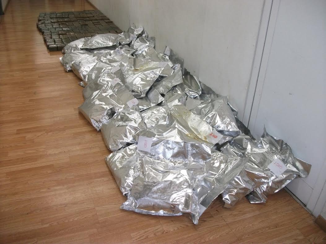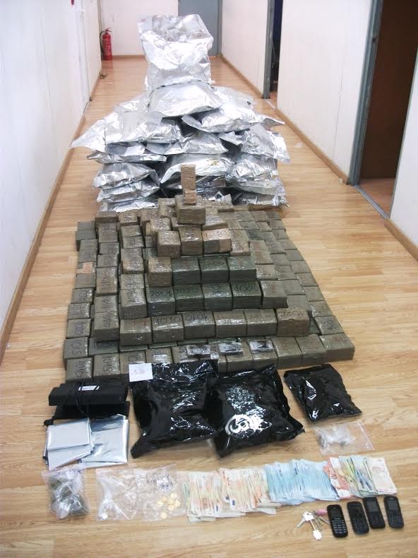 Στο αυτοκίνητο που εντοπίστηκε στο γκαράζ βρέθηκαν συνολικά 282 κιλά κατεργασμένης κάνναβης σε μορφή σοκολάτας, 41 κιλά skunk, 1,5 γραμμάριο κοκαΐνης και 12,8 γραμμάρια ηρωίνης.