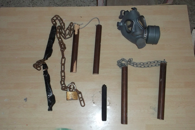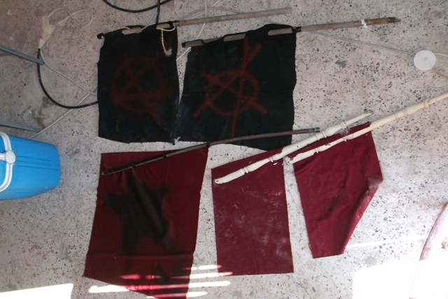Μέσα στον υπό κατάληψη χώρο βρέθηκαν, μεταξύ άλλων, τρία πανό, έξι κοντάρια με σημαίες, μια αντιασφυξιογόνο μάσκα, ένα πτυσσόμενο αστυνομικό γκλοπ, ένα σκεπάρνι, διάφορες χειρόγραφες σημειώσεις, ένα βαρέλι με πετρέλαιο, ένα μαχαίρι και πολλά άδεια μπουκάλια.
