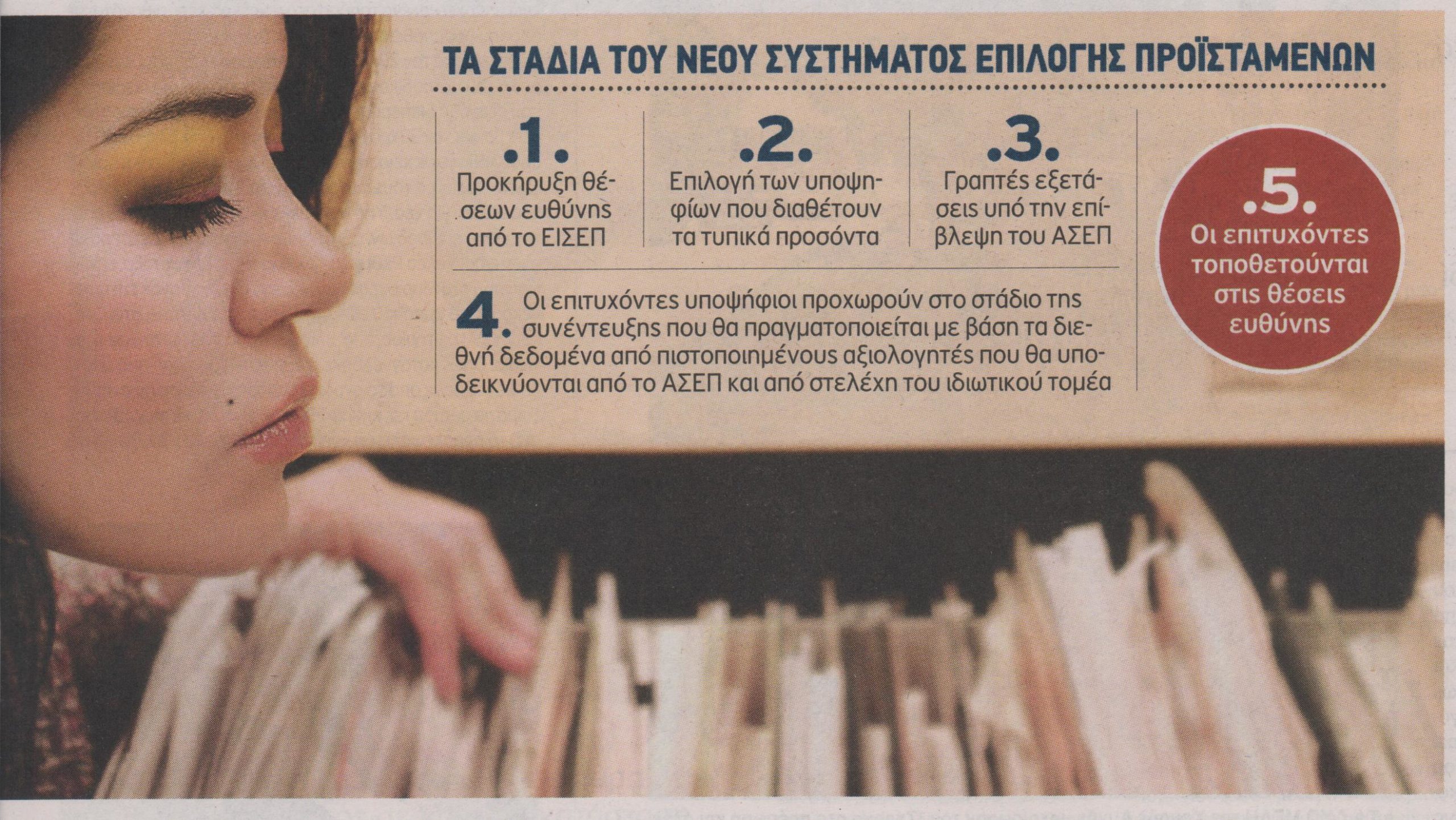 Nέα αντίληψη εισάγει η κυβέρνηση στην αξιολόγηση του έμψυχου δυναμικού των δημοσίων υπηρεσιών. Οι σωρευτικές απομακρύνσεις δίνουν τη θέση τους σε διαδικασίες με ποιοτικά χαρακτηριστικά. Στις αλλαγές περιλαμβάνεται και η επιλογή προϊσταμένων με γραπτές εξετάσεις και συνέντευξη υπό την αιγίδα του ΑΣΕΠ, σύμφωνα με το Εθνος.