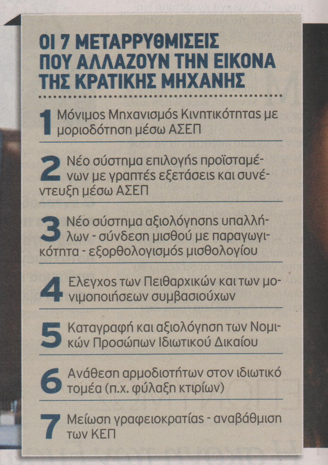 Σε νέα τροχιά μπαίνει η κρατική μηχανή με την εφαρμογή 7 σημαντικών μεταρρυθμίσεων που έχει προγραμματιστεί από το υπουργείο Διοικητικής Μεταρρύθμισης να υλοποιηθούν εντός του έτους.