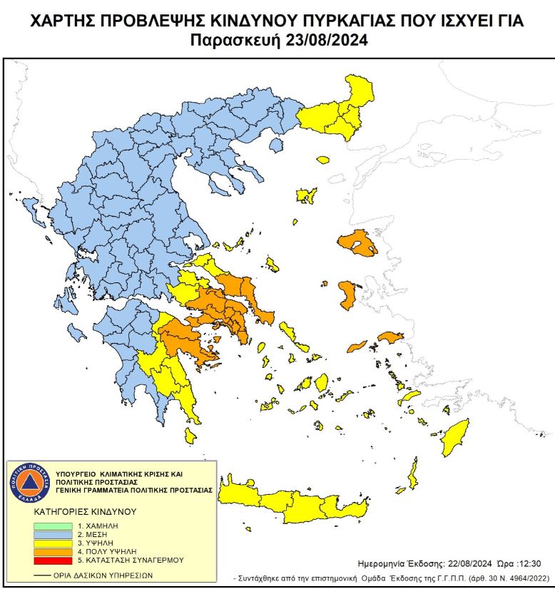 Σημειώνεται ότι σύμφωνα με το Χάρτη Πρόβλεψης Κινδύνου Πυρκαγιάς που εκδίδει η γενική γραμματεία Πολιτικής Προστασίας του υπουργείου Κλιματικής Κρίσης & Πολιτικής Προστασίας (civilprotection.gov.gr), πολύ υψηλός κίνδυνος πυρκαγιάς (κατηγορία κινδύνου 4) προβλέπεται αύριο για τις εξής περιοχές: