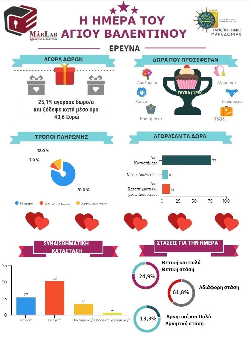 Αυτό προκύπτει από έρευνα του Εργαστηρίου Μάρκετινγκ MARLAB* του Πανεπιστημίου Μακεδονίας. Η έρευνα διεξήχθη διαδικτυακά στις 14 και 15 Φεβρουαρίου 2018 σε πανελλήνιο δείγμα 692 ατόμων, με επιστημονική ευθύνη της Διευθύντριας του MARLAB, καθηγήτριας, κ. Ροδούλας Τσιότσου. Η έρευνα κατέγραψε τις στάσεις και τις απόψεις των Ελλήνων για την Ημέρα του Αγίου Βαλεντίνου καθώς και την αγοραστική τους συμπεριφορά.