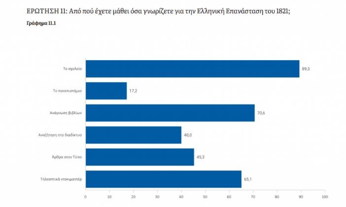 Τα αποτελέσματα εδώ είναι αναμενόμενα (βλ. Γράφημα 11.1). Το 89,3% γνωρίζει για την Επανάσταση όσα έμαθε στο σχολείο, καθώς επίσης από την ανάγνωση βιβλίων (70,6%) και την παρακολούθηση τηλεοπτικών ντοκιμαντέρ (65,1%). Ένα μεγάλο μέρος του πληθυσμού, σχεδόν το ήμισυ, ενημερώνεται για ιστορικά θέματα από τον Τύπο (45,3%) και το Διαδίκτυο (40,0%), ενώ μόνο το 17,2% δηλώνει ότι βασίζεται στις πανεπιστημιακές του σπουδές ή σε παρακολούθηση διαλέξεων (21,8%).