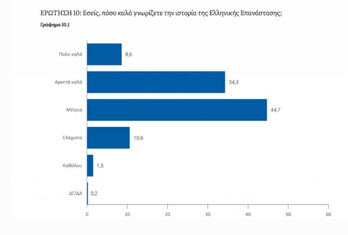 Οι απαντήσεις στις ερωτήσεις 9 και 10 αναδεικνύουν μια ενδιαφέρουσα γνωσιακή προκατάληψη: το 42,9% των Ελλήνων θεωρούν ότι οι ίδιοι γνωρίζουν καλά την Επανάσταση, αλλά ταυτόχρονα το 91,1% θεωρεί ότι οι υπόλοιποι τη γνωρίζουν ελάχιστα.