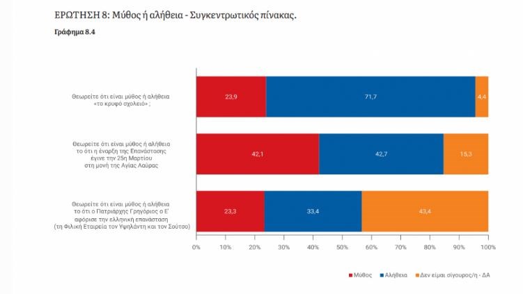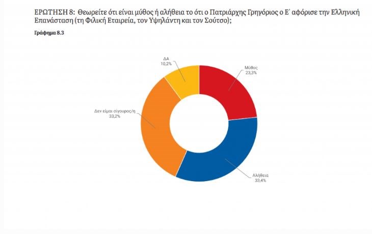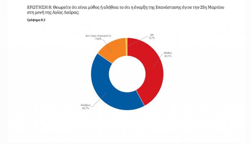 Ίσως αντιστρόφως, μόνο το 42,7% των Ελλήνων θεωρεί ότι η έναρξη της Επανάστασης έγινε στις 25 Μαρτίου στη μονή της Αγίας Λαύρας.