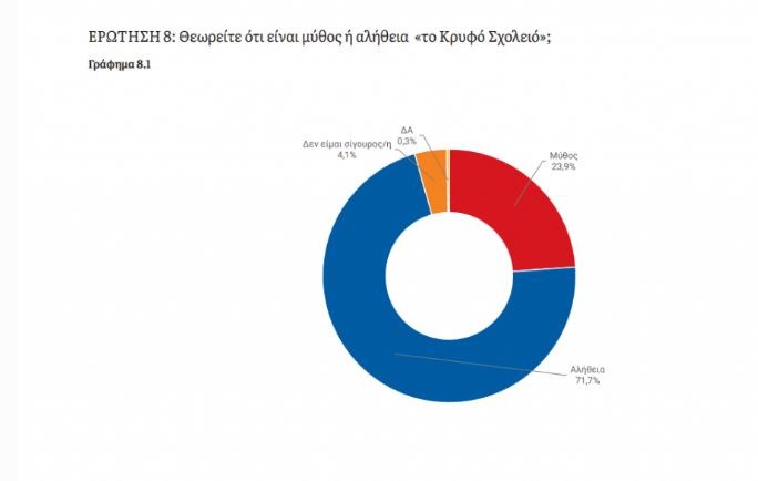 Δεν θα μπούμε στη συζήτηση για το Κρυφό Σχολειό, αφού αυτό που μας ενδιαφέρει είναι πώς το αντιμετωπίζει ο μέσος πολίτης. Παρά την αμφισβήτησή του από πολλούς ιστορικούς τα τελευταία χρόνια, το 71,7% των Ελλήνων θεωρεί πως όντως συνέβη.