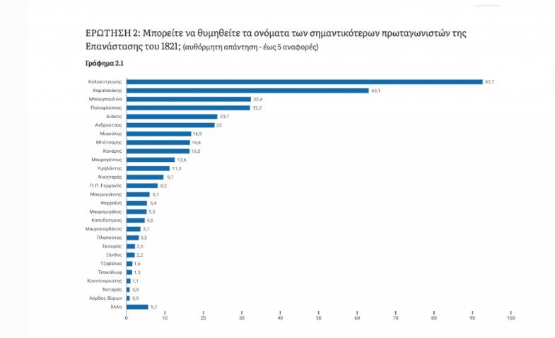 Στο ερώτημα του Γραφήματος 2.1 ζητήσαμε αυθόρμητες απαντήσεις για να καταγραφούν αδιαμεσολάβητα τα ονόματα εκείνων των προσώπων που ο μέσος πολίτης θεωρεί ότι πρωταγωνίστησαν στην Επανάσταση.