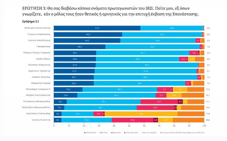 Ένα άλλο αξιοσημείωτο στοιχείο είναι η παρουσία στον κατάλογο του Ρήγα Βελενστινλή, αν και ο Ρήγας δεν πρόλαβε να συμμετάσχει στα γεγονότα της Επανάστασης. Δεν υπάρχει κανείς που να αξιολογείται από την πλειοψηφία αρνητικά. Ακόμα και ο Ιωάννης Κωλέττης, ο λιγότερο δημοφιλής, έχει μεγαλύτερο ποσοστό θετικών παρά αρνητικών αποτιμήσεων. Το αμέσως υψηλότερο αρνητικό ποσοστό συγκεντρώνει ο Πετρόμπεης Μαυρομιχάλης.
