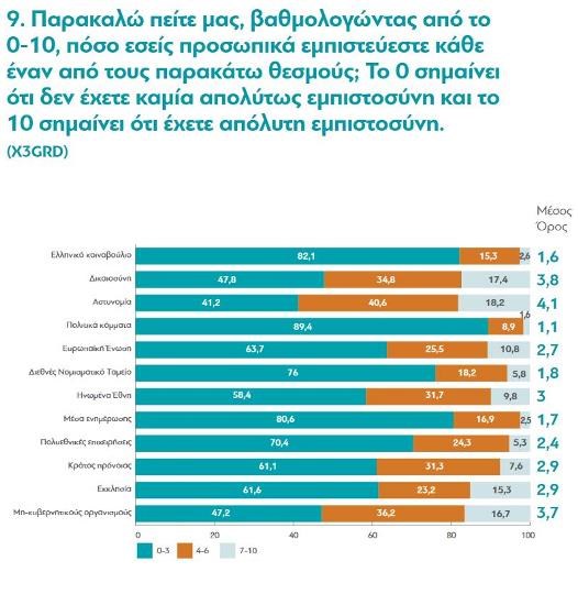 Απαντώντας στην ίδια ερώτηση οι γονείς δίνουν την υψηλότερη βαθμολογία στην αστυνομία 6/10, τη Δικαιοσύνη 5,1/10 και την εκκλησία 5,1/10, και τη χαμηλότερη στο ελληνικό κοινοβούλιο με 2,3, το ΔΝΤ με 2,2 και τα πολιτικά κόμματα 1,5.