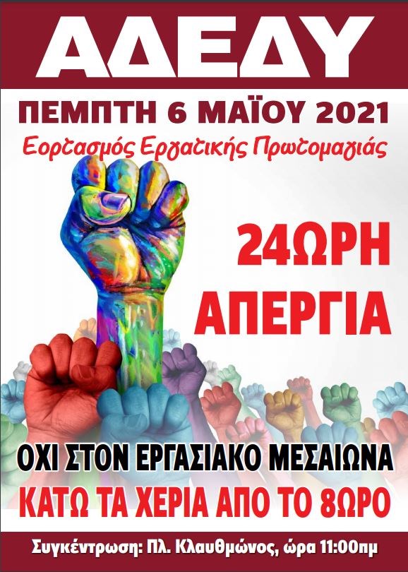 Η Εκτελεστική Επιτροπή της Α.Δ.Ε.Δ.Υ., απορρίπτοντας τους κυβερνητικούς σχεδιασμούς για υποβάθμιση και απονεύρωση του φετινού εορτασμού, προκηρύσσει 24ωρη Πανδημοσιοϋπαλληλική απεργία για τον εορτασμό της Εργατικής Πρωτομαγιάς, την Πέμπτη, 6 Μάιου 2021 και συγκέντρωση στην πλατεία Κλαυθμώνος στις 11:00πμ. Η Εκτελεστική Επιτροπή της Α.Δ.Ε.Δ.Υ., παράλληλα, καλεί Ομοσπονδίες και Εργατικά Κέντρα του Ιδιωτικού Τομέα να πλαισιώσουν με τις αποφάσεις και τη συμμετοχή τους τον αγωνιστικό και ταξικό εορτασμό” υπογραμμίζεται αναλυτικά στην ανακοίνωση της ΑΔΕΔΥ.