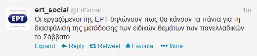 Οι εργαζόμενοι της ΕΡΤ δήλωσαν μέσω twitter ότι θα κάνουν τα πάντα για τη διασφάλιση της μετάδοσης των ειδικών θεμάτων των πανελλαδικών το Σάββατο.