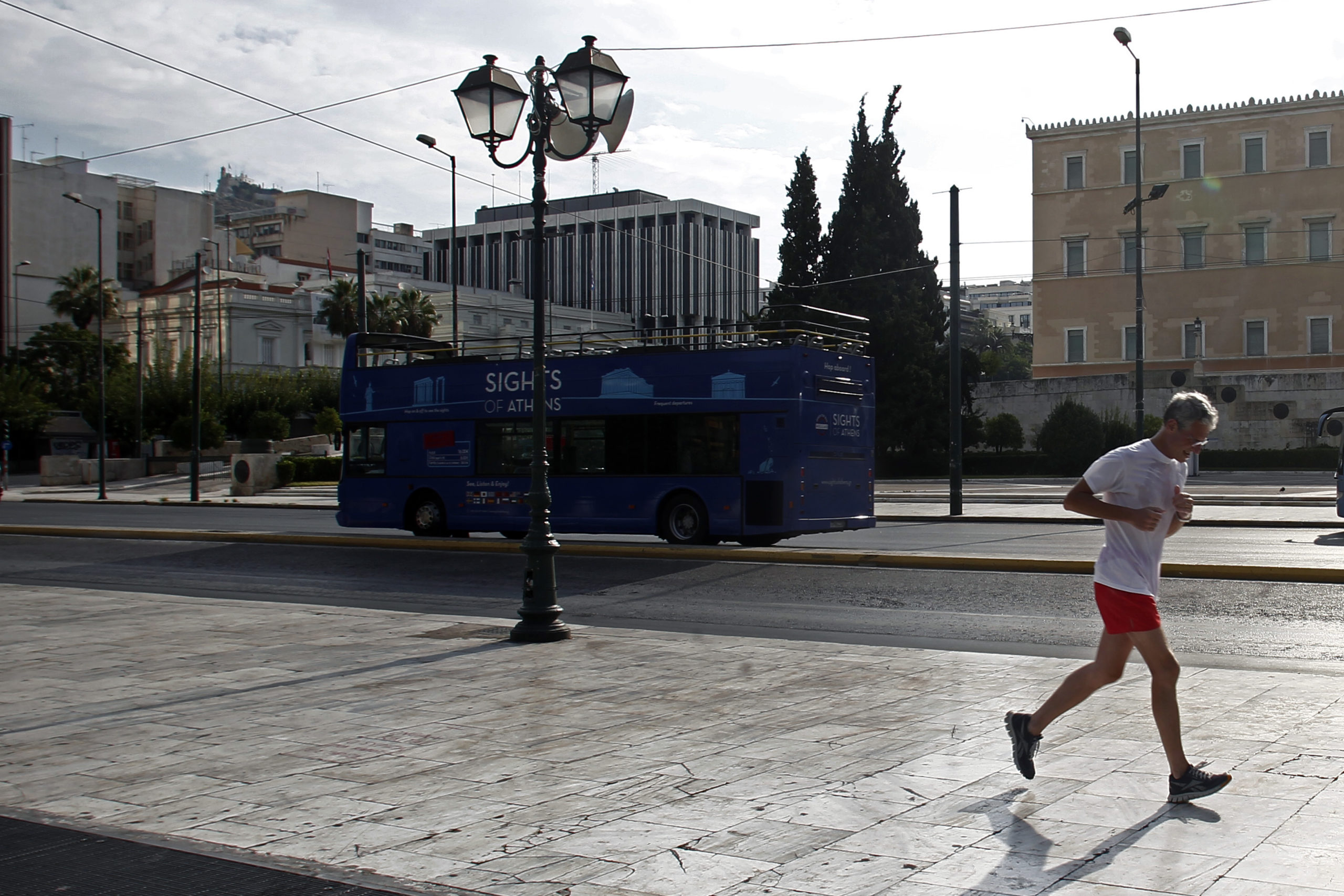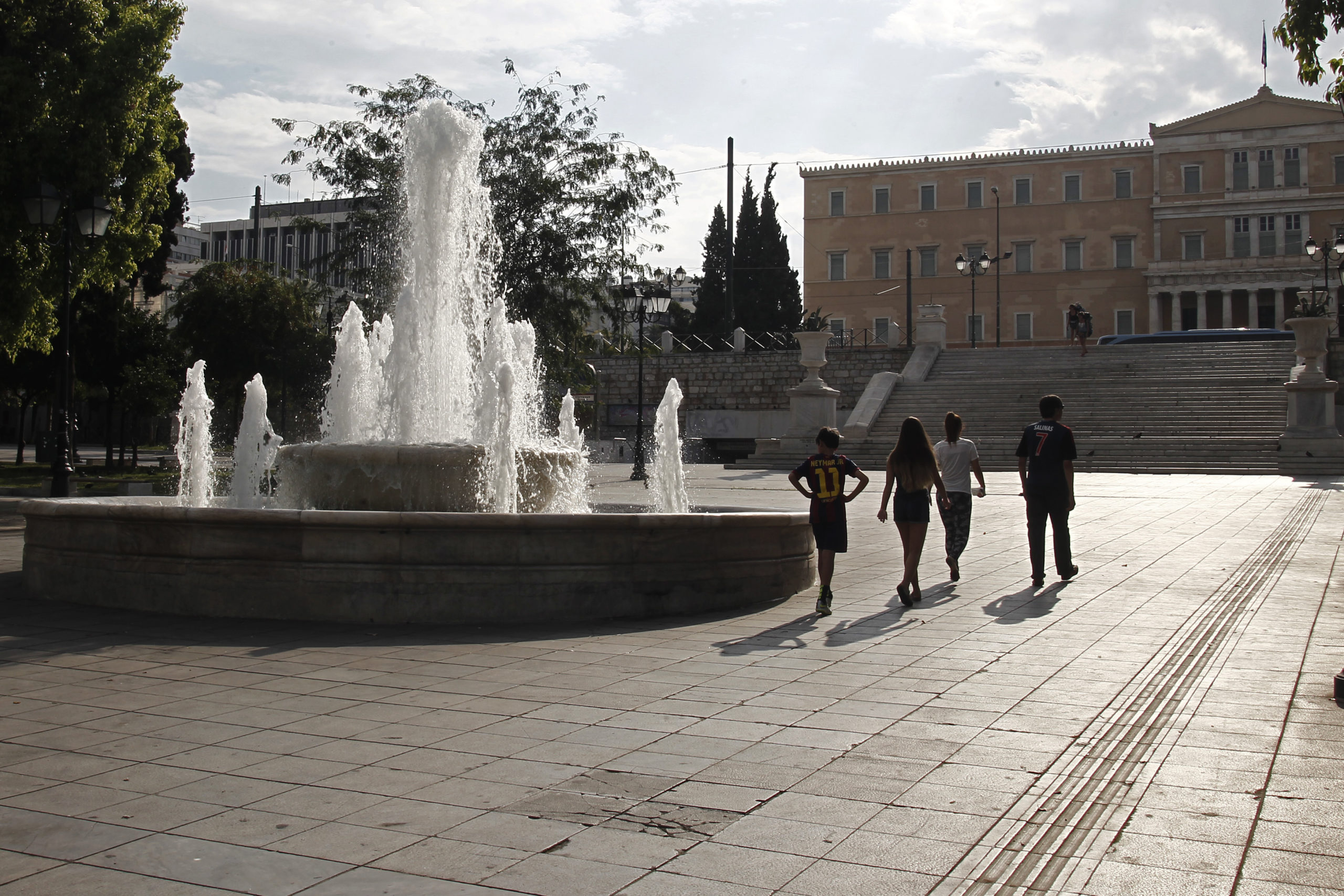Η πλατεία Συντάγματος σχεδόν άδεια, με λιγοστούς τουρίστες να κάνουν τη βόλτα τους, στην έρημη πόλη.