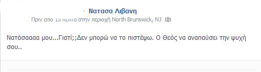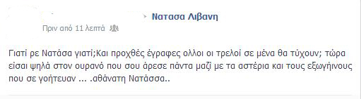 Από την ώρα που έγινε γνωστή η είδηση του θανάτου της, η προσωπική της σελίδα στο Facebook έχει γεμίσει μηνύματα από τους φίλους της.