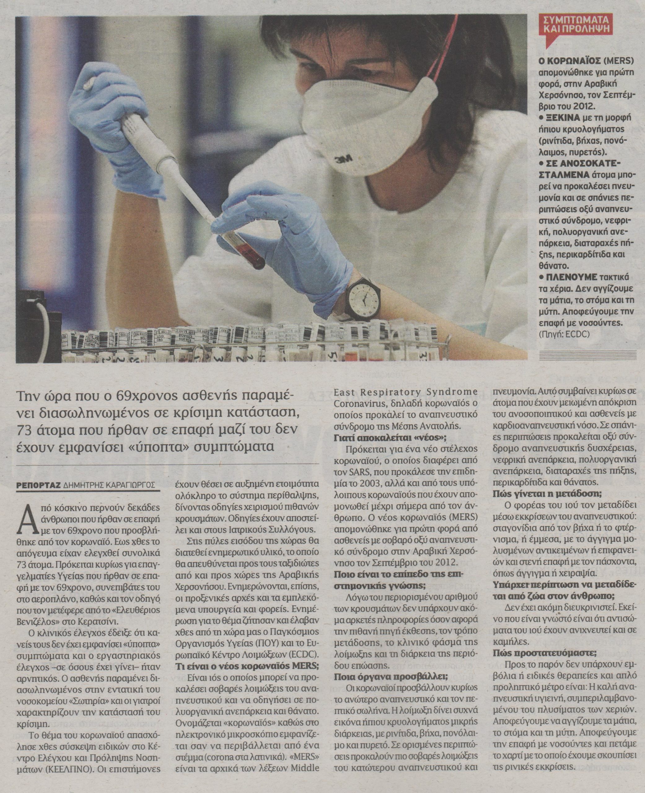 Το θέμα το κορωναϊού απασχόλησε χθες σύσκεψη ειδικών στο Κέντρο Ελέγχου και Πρόληψης Νοσημάτων (ΚΕΕΛΠΝΟ). Οι επιστήμονες έχουν θέσει σε αυξημένη ετοιμότητα ολόκληρο το σύστημα περίθαλψης, δίνοντας οδηγίες χειρισμού πιθανών κρουσμάτων. Οδηγίες έχουν αποστείλει και στους Ιατρικούς Συλλόγους.