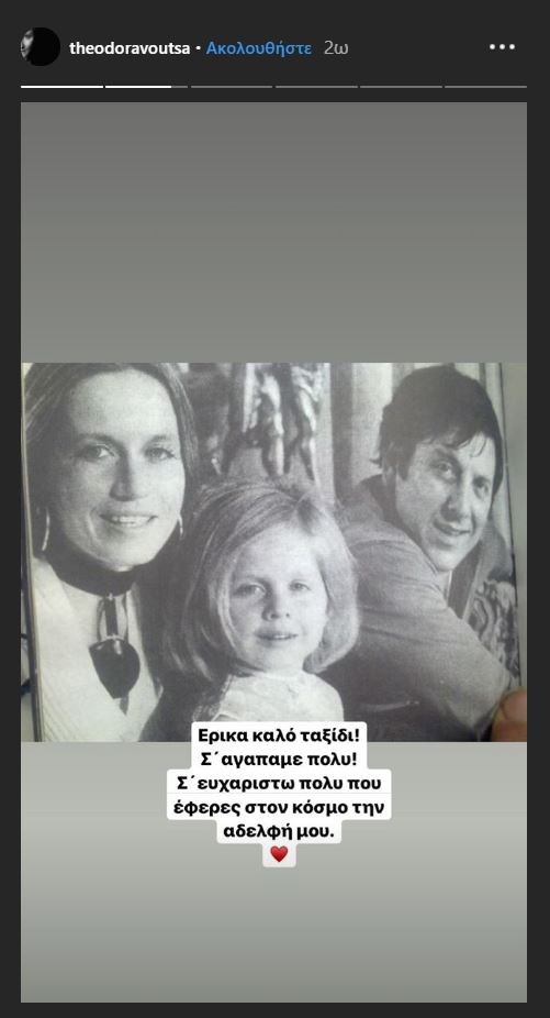 «Έρρικα καλό ταξίδι! Σ’ αγαπάμε πολύ! Σ’ ευχαριστώ πολύ που έφερες στον κόσμο την αδελφή μου» έγραψε η Θεοδώρα Βουτσά αποχαιρετώντας την πρώην σύζυγο του πατέρα της Κώστα Βουτσά και μητέρα της αδερφής της Σάντρα Βουτσά.