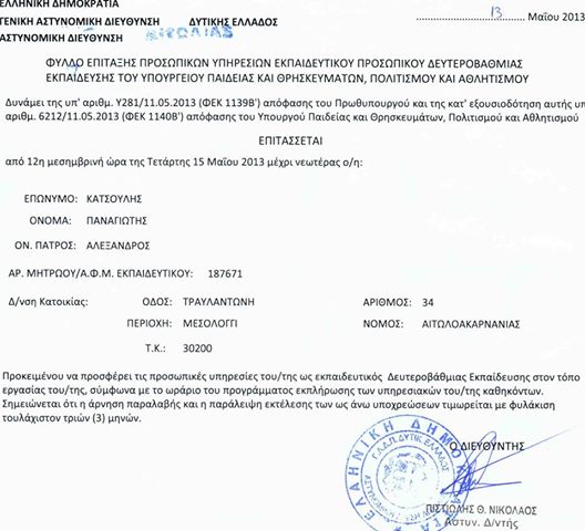 Φύλλο πορείας έλαβε ο Δήμαρχος Ιεράς Πόλεως Μεσολογγίου Παναγιώτης Κατσούλης προκειμένου να προσφέρει τις υπηρεσίες του ως εκπαιδευτικός στον τόπο εργασίας του, σε περίπτωση μάλιστα που δεν παρουσιαστεί θα τιμωρηθεί με ποινή φυλάκισης τουλάχιστον 3 μηνών.