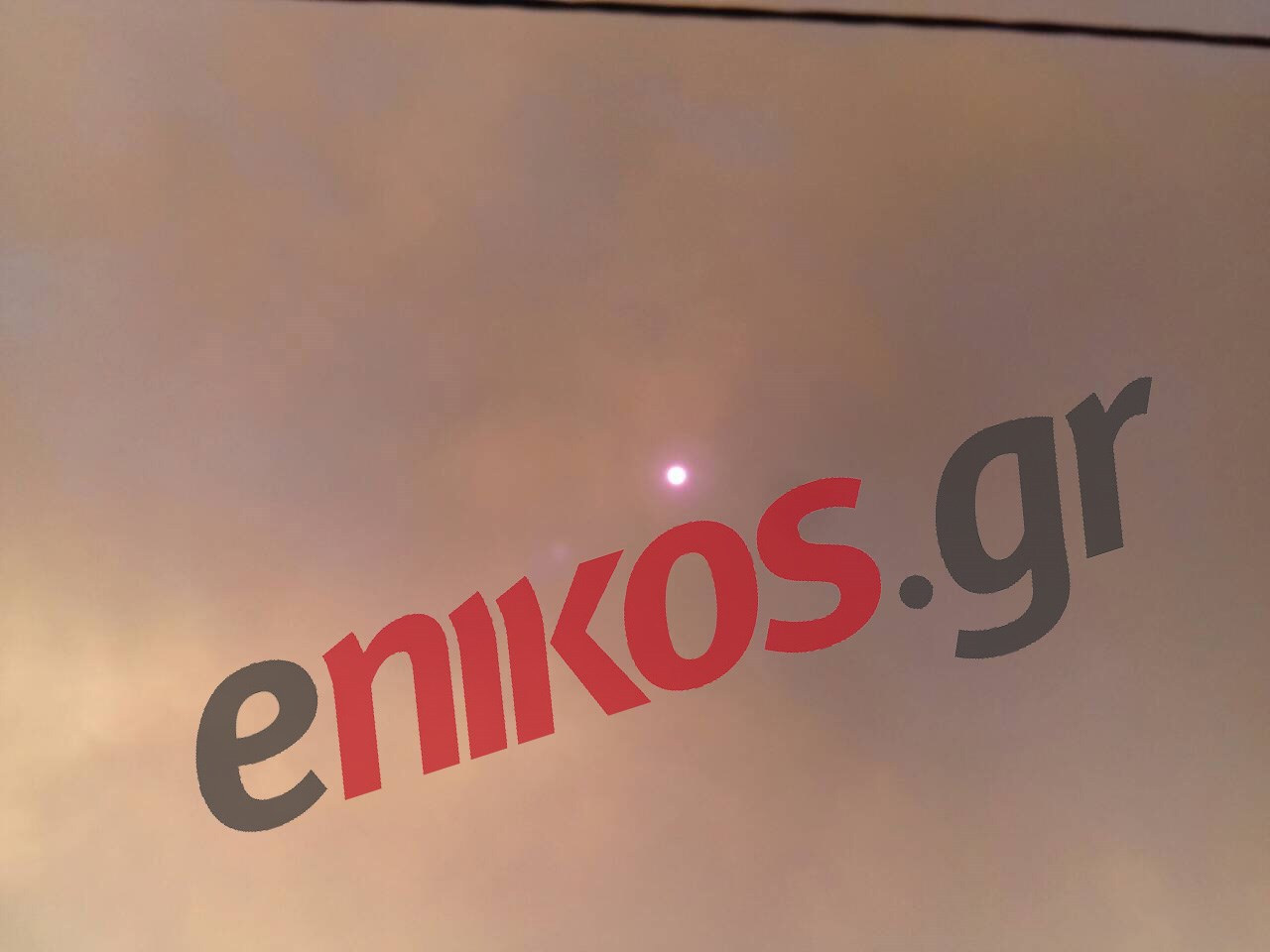 “Μαύρισε” ο ουρανός στο Πέραμα από τον πυκνό καπνό, λόγω της μεγάλης φωτιάς στα Γεράνεια Όρη στα ύψος της Κινέτας.