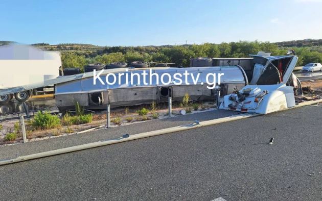 Σύμφωνα με πληροφορίες του Korinthostv, ο οδηγός ενός φορτηγού έχασε τον έλεγχο του οχήματος όταν έσκασε το λάστιχο, με αποτέλεσμα αυτό να εκτραπεί της πορείας του, να ανατραπεί και να καταλήξει στις προστατευτικές μπάρες.