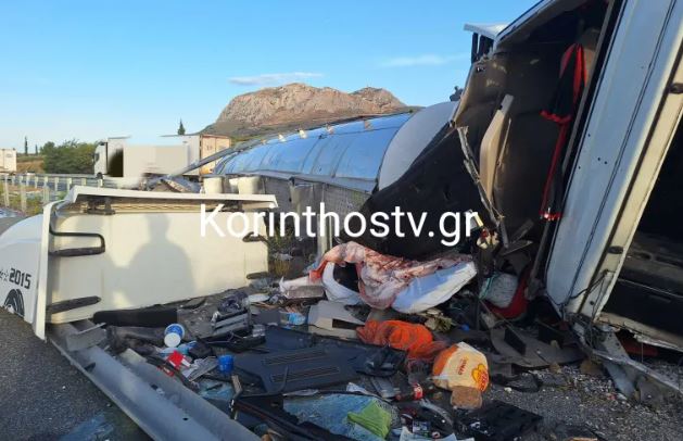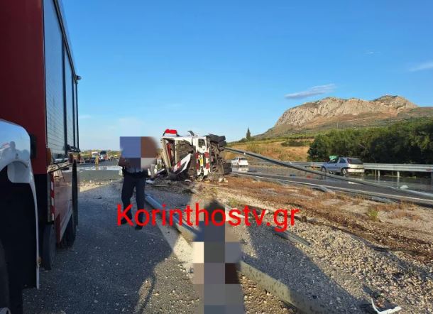Σύμφωνα με πληροφορίες του Korinthostv, ο οδηγός ενός φορτηγού έχασε τον έλεγχο του οχήματος όταν έσκασε το λάστιχο, με αποτέλεσμα αυτό να εκτραπεί της πορείας του, να ανατραπεί και να καταλήξει στις προστατευτικές μπάρες.
