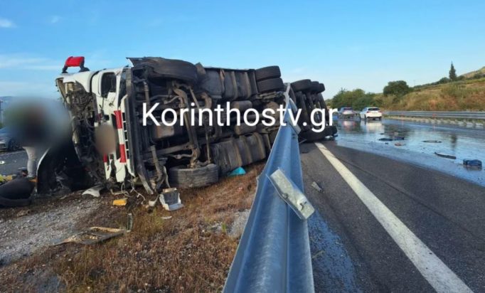Σύμφωνα με πληροφορίες του Korinthostv, ο οδηγός ενός φορτηγού έχασε τον έλεγχο του οχήματος όταν έσκασε το λάστιχο, με αποτέλεσμα αυτό να εκτραπεί της πορείας του, να ανατραπεί και να καταλήξει στις προστατευτικές μπάρες.