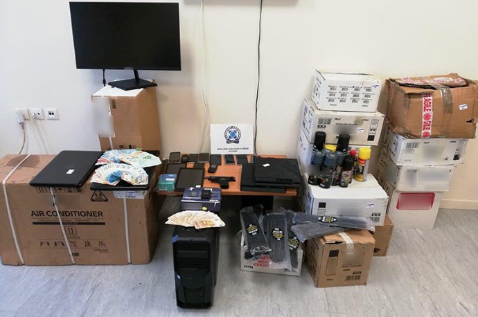 Από τις έρευνες που διενεργήθηκαν σε οικίες και γραφεία, βρέθηκαν και κατασχέθηκαν: 3 αυτοκίνητα, τράκτορας, ζεύγος πλαστών πινακίδων κυκλοφορίας, 2 «εγκέφαλοι» οχημάτων, 2 πιστόλια με 1 άδειο γεμιστήρα, 24 φυσίγγια, σιδερογροθιά, μαχαίρι κυνηγετικού τύπου, με θήκη, τo χρηματικό ποσό των 49.272 ευρώ, 2 συστήματα δορυφορικού εντοπισμού (GPS), 327 τεμάχια καθαριστικών για οχήματα, πλήθος ηλεκτρονικών συσκευών και τιμαλφών, έγγραφα, τιμολόγια, μπλοκ επιταγών, βιβλιάρια καταθέσεων, τραπεζικά έγγραφα και σφραγίδες διαφόρων εταιρειών, 127 προϊόντα εταιρείας ηλεκτρονικής τεχνολογίας (φορητοί υπολογιστές, οθόνες κλπ), 33 κινητά τηλέφωνα, 4 φορητές ταμπλέτες (tablet) και 3 φορητοί υπολογιστές, καθώς και 4.649 φιάλες οινοπνευματώδους ποτού.