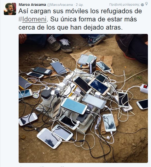 «Έτσι φορτίζουν τα κινητά τους τηλέφωνα στην Ειδομένη οι πρόσφυγες. Ο μόνος τρόπος να έρθουν κοντά με αυτούς που έχουν αφήσει πίσω τους», αναφέρει ο Ισπανός δημοσιογράφος, αναρτώντας τη συγκεκριμένη φωτογραφία.