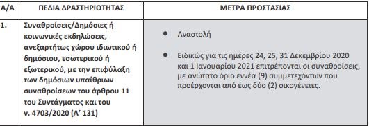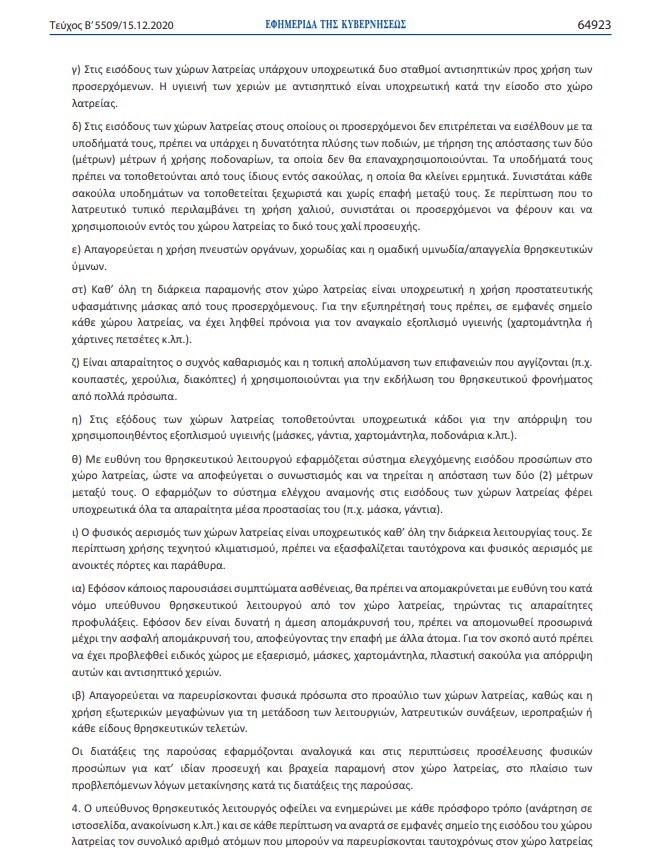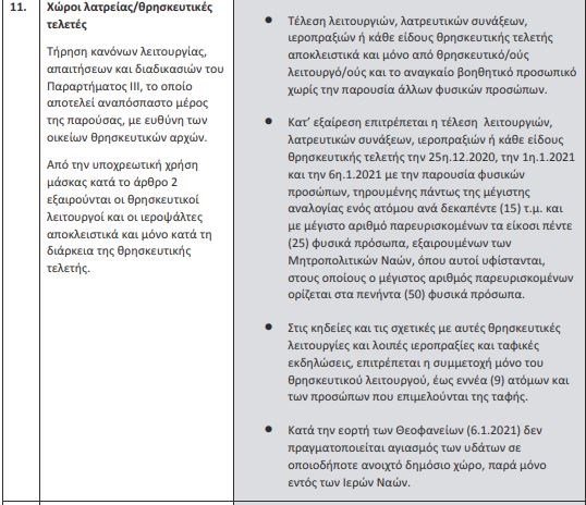 Για τις εκκλησίες προβλέπεται η τέλεση λειτουργιών στις 25/12/2020, 1/1/2021 και 6/1/2021 με παρουσία πιστών. Ένα πιστός ανά 15τ.μ. με μέγιστο αριθμό 25 πιστών για τους ιερούς ναούς και μέγιστο αριθμό 50 ατόμων για μητροπολιτικούς ναούς. Για τα Θεοφάνεια απαγορεύεται η τέλεση αγιασμού υδάτων σε ανοιχτούς χώρους. Αγιασμός των υδάτων επιτρέπεται μόνο εντός των ιερών ναών.