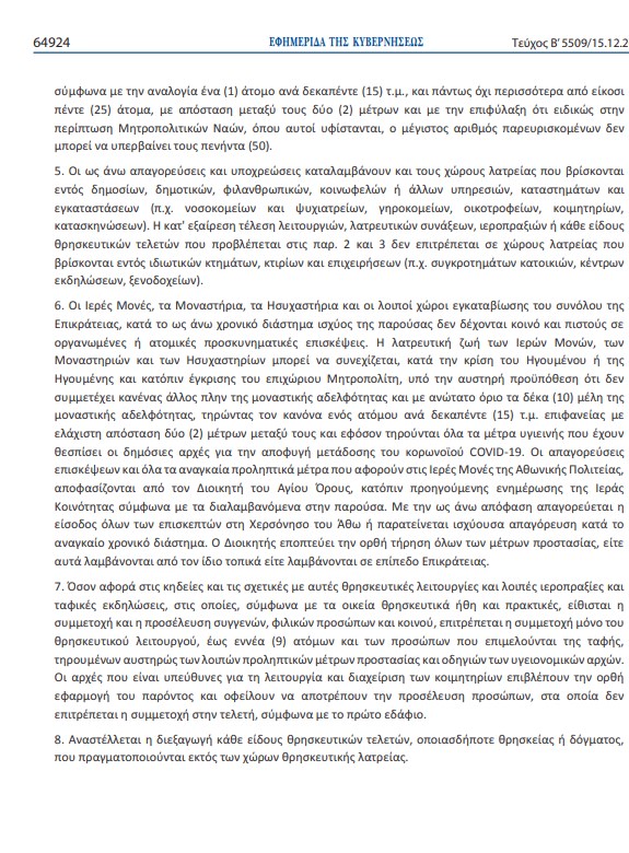 1) Οἱ Ἱεροί Ναοί θά παραμένουν ἀνοικτοί γιά τούς πιστούς τόσο γιά προσκύνηση καί κατ᾿ ἰδίαν προσευχή, ὅσο καί γιά προσέλευση κατά τίς κύριες Θεῖες Λειτουργίες τῶν τριῶν μεγάλων Ἑορτῶν τοῦ Ἁγίου Δωδεκαημέρου (Χριστούγεννα, Περιτομή τοῦ Χριστοῦ, Θεοφάνεια), τηρουμένων τῶν προβλεπομένων ἀποστάσεων καί μέτρων ἀποφυγῆς τοῦ συνωστισμοῦ (1 πρόσωπο ἀνά 15 τ.μ. ἐπιφανείας, μέ ἐλάχιστη ἀπόσταση 2 μέτρων μεταξύ τους καί μέ ὑποχρεωτική τήν χρήση μάσκας καθ᾿ ὅλη τήν διάρκεια τῶν ἱεροπραξιῶν), μέ ἐπιτρεπόμενο ἀριθμό πιστῶν σέ μικρούς Ναούς τόν ἀριθμό τῶν 25 προσώπων καί σέ κεντρικούς Ναούς τῶν 50 προσώπων.