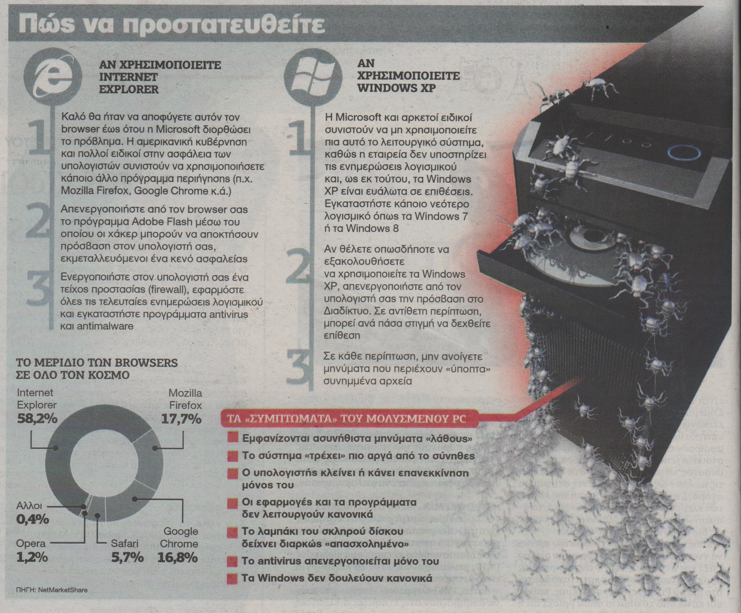 Η αμερικανική κυβέρνηση συνέστησε στους χρήστες να εγκαταλείψουν τον Internet Explorer έως ότου η εταιρεία κλείσει μια σημαντική τρύπα ασφαλείας στο λογισμικό της το οποίο επιτρέπει σε χάκερ να εξαπολύσουν ηλεκτρονικές επιθέσεις υποκλέπτοντας τα προσωπικά μας δεδομένα. Το πρόβλημα απειλεί δυνητικά περισσότερους από τους μισούς χρήστες του Διαδικτύου σε όλο τον κόσμο (τόσοι έχουν εγκαταστημένο τον Internet Explorer στους υπολογιστές τους).