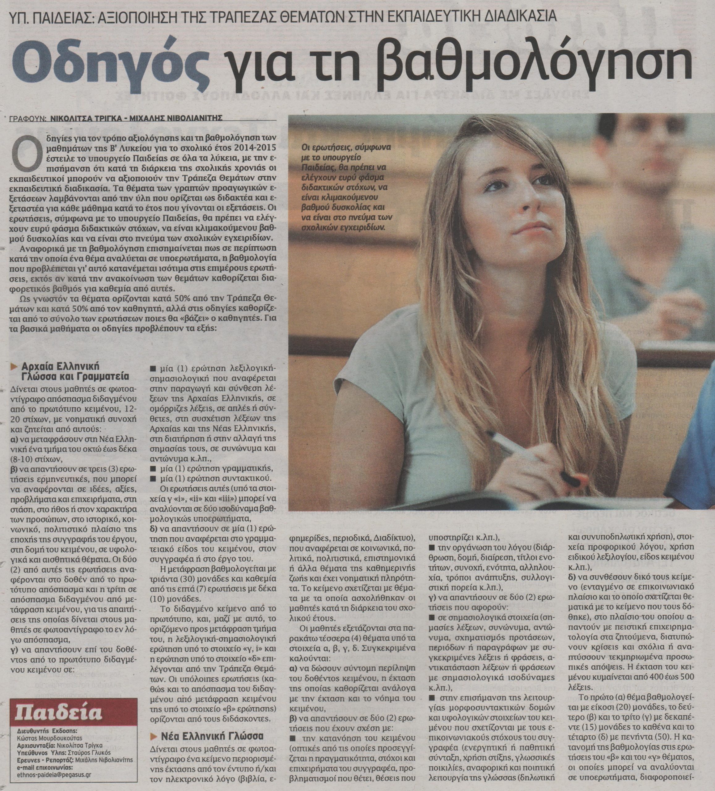Οδηγίες για τον τρόπο αξιολόγησης και τη βαθμολόγηση των μαθημάτων της Β’ Λυκείου για το σχολικό έτος 2014-2015 έστειλε το υπουργείο Παιδείας σε όλα τα λύκεια, με την επισήμανση ότι κατά τη διάρκεια της σχολικής χρονιάς οι εκπαιδευτικοί μπορούν να αξιοποιήσουν την Τράπεζα Θεμάτων στην εκπαιδευτική διαδικασία.