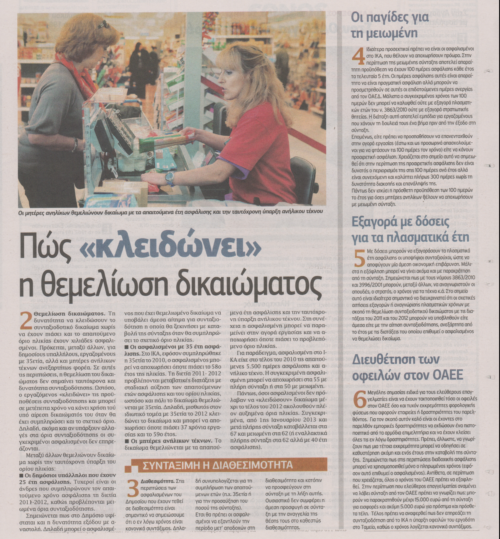 «Ανάσα» στους ασφαλισμένους προσφέρουν και μια σειρά διατάξεων που επιτρέπουν τη θεμελίωση δικαιώματος ακόμα και χωρίς την ταυτόχρονη συμπλήρωση του ορίου ηλικίας (π.χ. 25ετία στο Δημόσιο, 35ετία στα Ταμεία, διατάξεις για μητέρες ανηλίκων). Οι ασφαλισμένοι μπορούν με τον τρόπο αυτό να «κλειδώσουν» το συνταξιοδοτικό δικαίωμα και να αποχωρήσουν όποτε πιάσουν το κατά περίπτωση όριο ηλικίας χωρίς να επηρεάζονται από τυχόν ανατροπές στο Ασφαλιστικό.