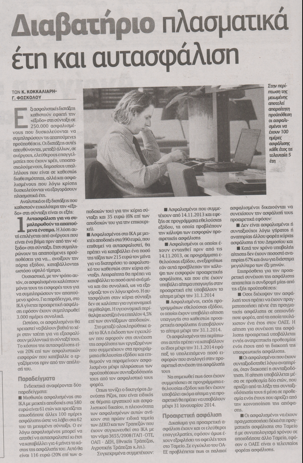 ‘Οσον αφορά τους ανέργους, η αυτασφάλιση είναι μία λύση για τη συμπλήρωση των απαιτούμενων ενσήμων. Ωστόσο, το τίμημα είναι υψηλό κυρίως για όσους χρειάζονται πολλά ένσημα, αλλά και για όσους είχαν καλό μισθό πριν από την απόλυσή τους. Σημειώνεται πως στη λύση της αυτασφάλισης μπορεί να χρειαστεί να στραφούν και εργαζόμενοι που θέλουν να πάρουν μειωμένη σύνταξη από το ΙΚΑ, αλλά δεν έχουν 100 ημέρες απασχόλησης τον χρόνο. Για να ανοίξουν πρόωρα την πόρτα εξόδου από το μεγαλύτερο Ταμείο της χώρας θα πρέπει απαραιτήτως να πληρούν αυτή την προϋπόθεση την τελευταία πενταετία.