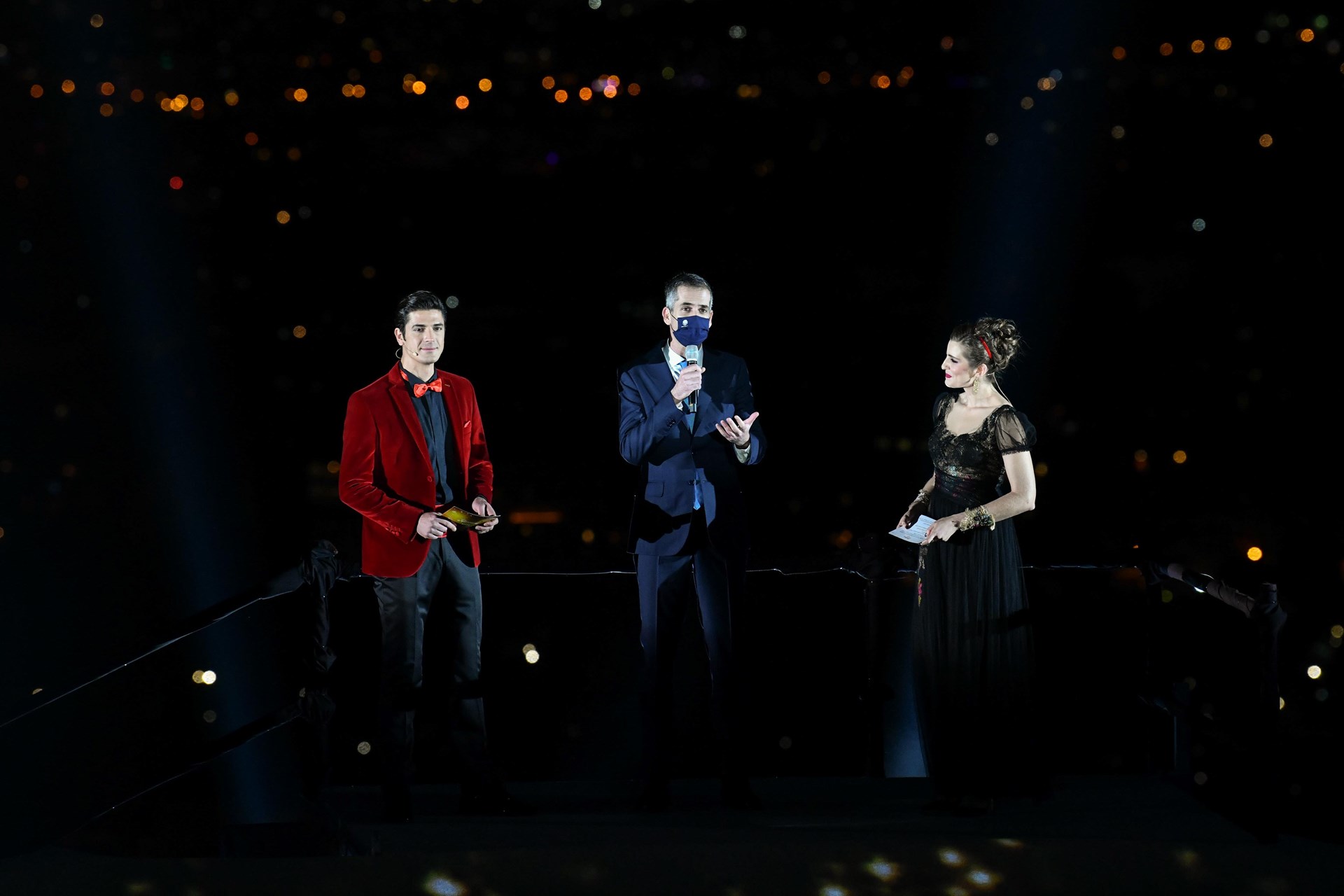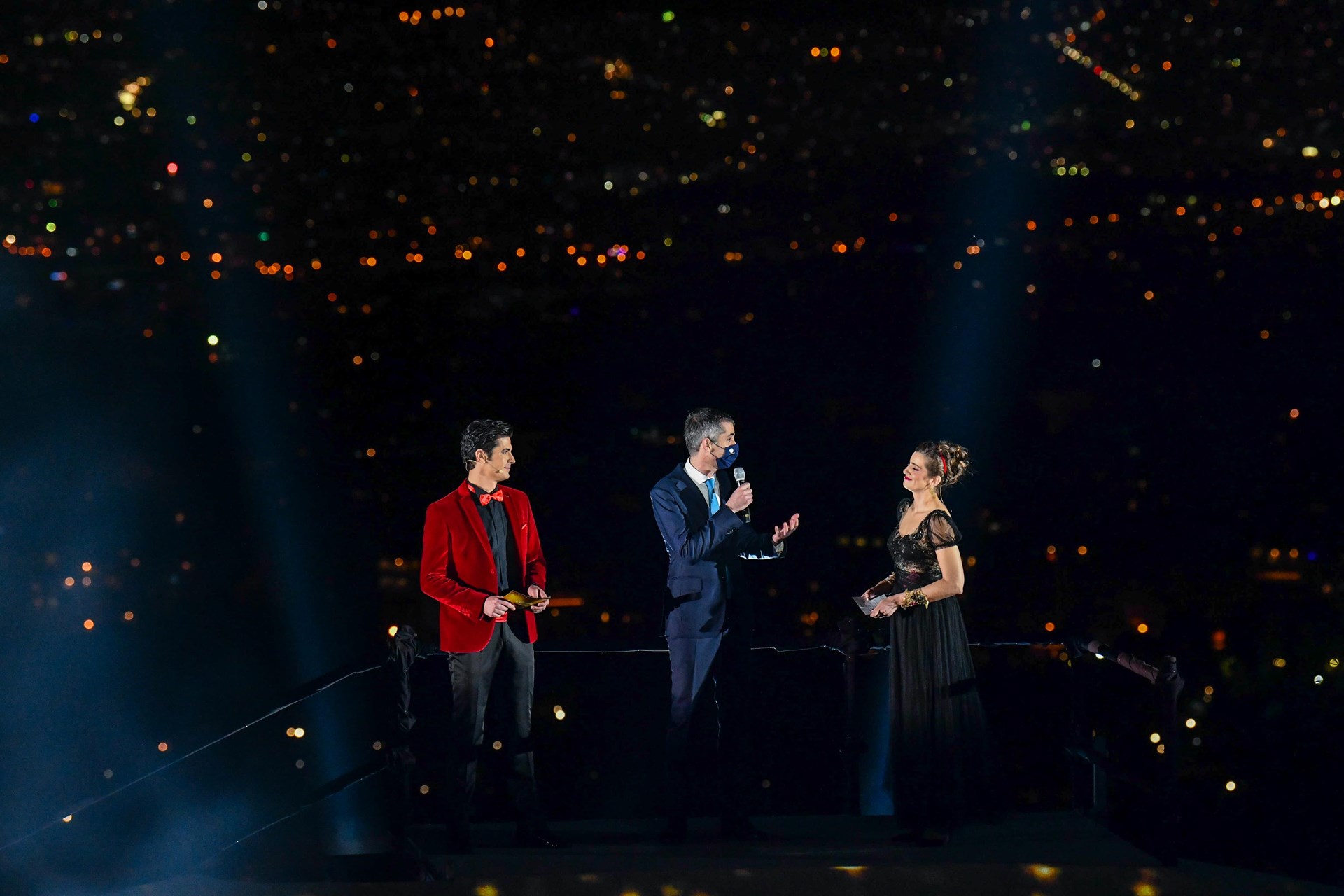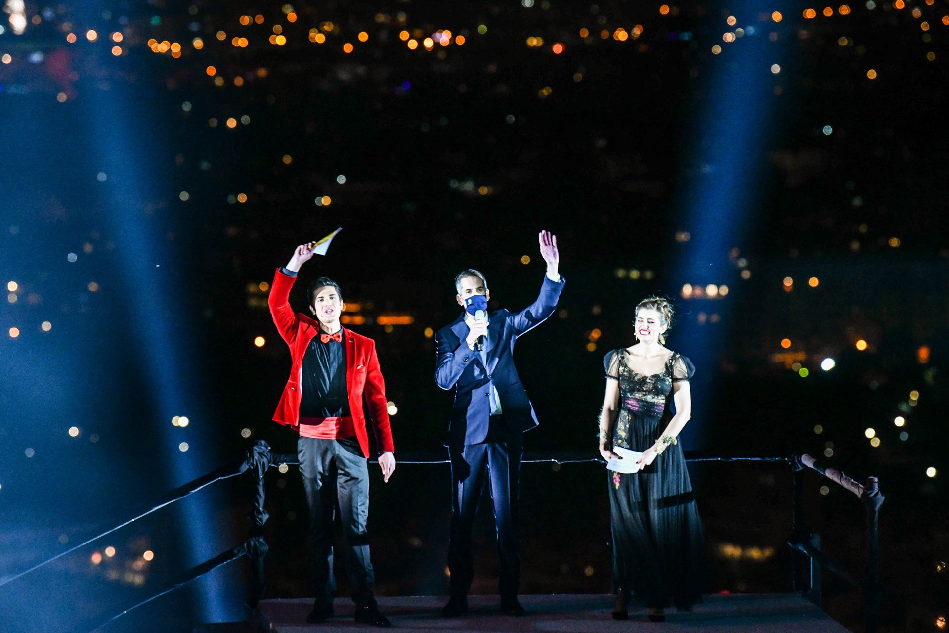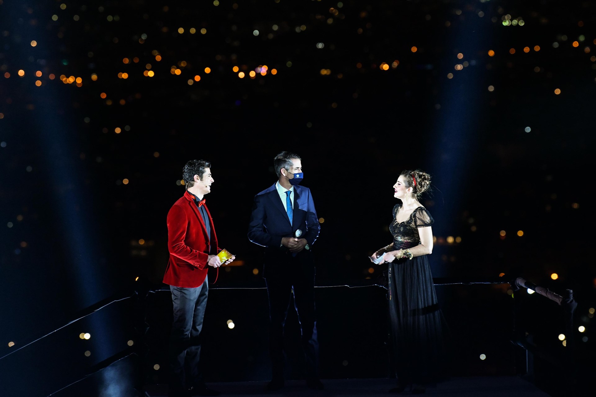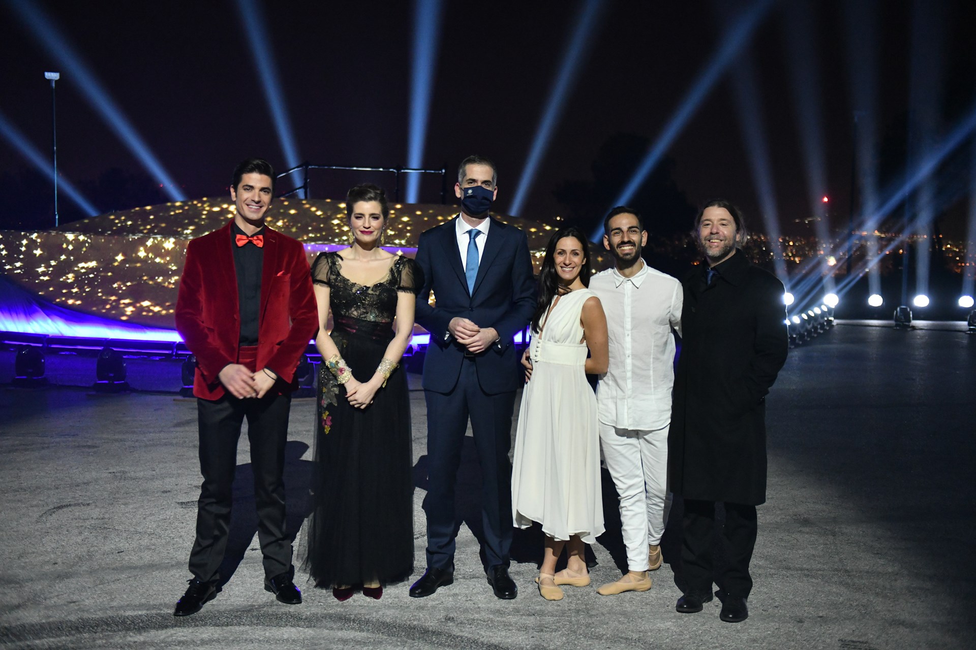 Οικοδεσπότες της βραδιάς ήταν δύο από τις πολύ αγαπημένες παρουσίες της ελληνικής τηλεόρασης, δύο ιδιαίτερα ταλαντούχοι ηθοποιοί, η Μαρία Κίτσου και ο Δημήτρης Γκοτσόπουλος. Λίγο πριν από τα μεσάνυχτα, οι παρουσιαστές υποδέχτηκαν στη σκηνή τον Δήμαρχο Αθηναίων, Κώστα Μπακογιάννη. «Το 2021 να μας βρει όλους υγιείς. Να μας βρει όλους νικητές. Άλλωστε η ζωή πάντα νικά. Να είμαστε λοιπόν όλοι μαζί, να είμαστε όλοι καλά και σύντομα να μπορούμε να πάρουμε μια μεγάλη ανάσα. Ανάσα αγάπης, ανάσα ελπίδας, ανάσα ζωής», ήταν η ευχή του Δημάρχου Αθηναίων για τη νέα χρονιά.