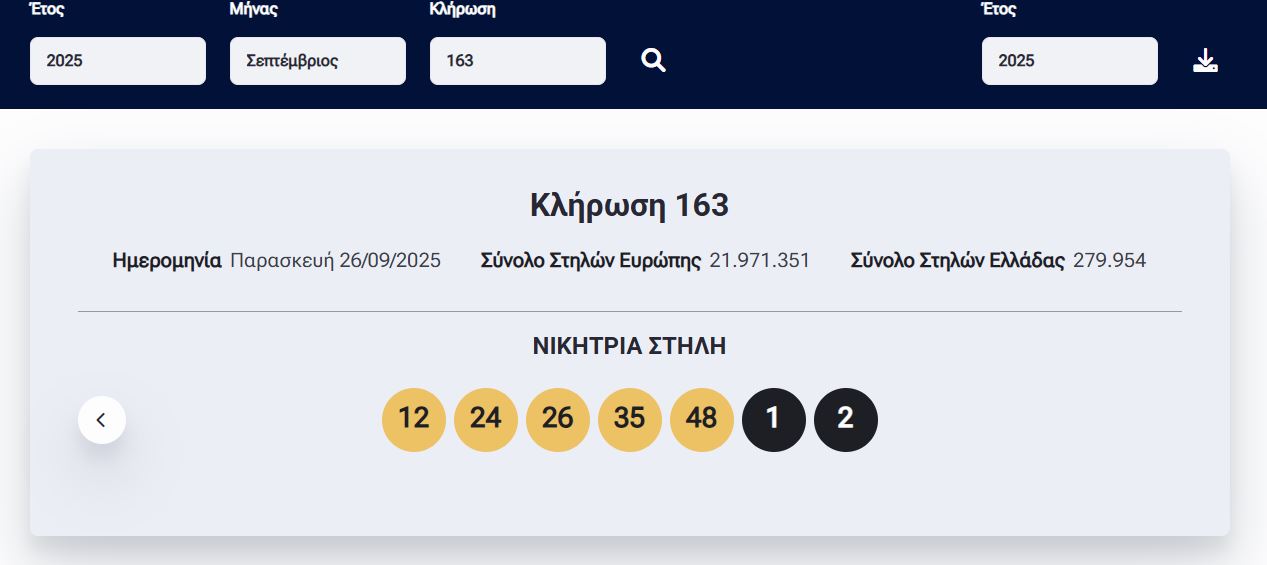 Οι τυχεροί αριθμοί στη αποψινής κλήρωσης με αριθμό 163 είναι οι εξής: 12, 24, 26, 35, 48 και 1, 2.