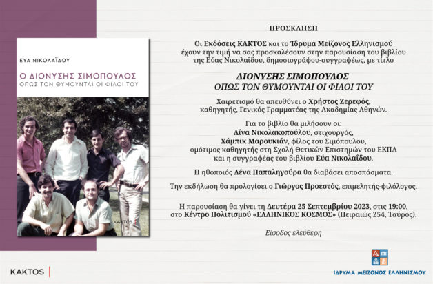Η παρουσίαση του βιβλίου θα γίνει Δευτέρα 25 Σεπτεμβρίου, στις 19:00 το απόγευμα, στο Κέντρο Πολιτισμού «ΕΛΛΗΝΙΚΟΣ ΚΟΣΜΟΣ» (Πειραιώς 254, Ταύρος). Διατίθεται και πάρκινγκ στον ίδιο χώρο.