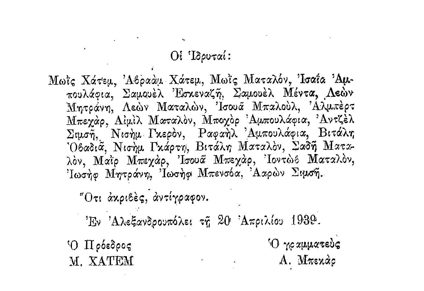 20 Απριλίου 1939, οι Ιδρυτές της Ισραηλιτικής Κοινότητας Αλεξανδρούπολης στο Καταστατικό της όπως δημοσιεύτηκε στο ΦΕΚ. Η Κοινότητα φυσικά ήταν παλιότερη, αλλά τη δεκαετία του 1930 όλες οι Ισραηλιτικές κοινότητες της Ελλάδας απέκτησαν επίσημο κανονισμό λειτουργίας, που δημοσιεύτηκε στην Εφημερίδα της Κυβερνήσεως. (πηγή: Γειτονιές & Αναμνήσεις Αλεξανδρούπολης/μελέτη Θρασύβουλου Παπαστρατή)