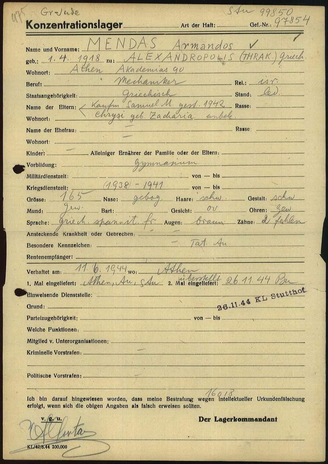 φύλλο μεταφοράς του Αλεξανδρουπολίτη Εβραϊκής καταγωγής Πιλότου Αρμάνδου Μέντα (γεν. 1/4/18). Μεταφέρθηκε από τα κρατητήρια της οδού Ακαδημίας 90 στην Αθήνα μαζί με τους Εβραίους της Κέρκυρας στο Άουσβιτς τον Ιούνιο 1944. Στις 26/11/44 τον πήγαν στο Στούτχοφ και κατόπιν στο Μπούχενβαλτ. Δεν επέζησε.