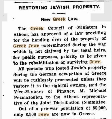 15 Νοεμβρίου 1945, στην εφημερίδα “The Hebrew Standard” της Αυστραλίας υπάρχει άρθρο με τίτλο “Restoring Jewish Property” και αναφέρεται στο νέο νόμο του Ελληνικού κράτους.