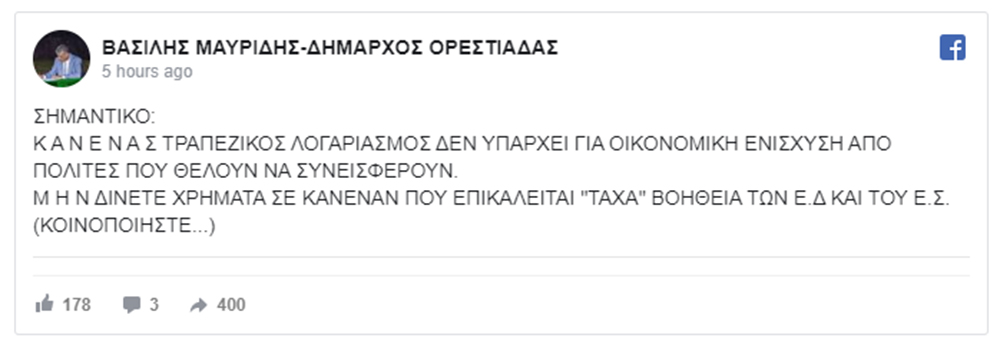 Σε μια ανάρτηση… καταγγελία στην προσωπική του σελίδα στο Facebook προχώρησε ο Δήμαρχος Ορεστιάδας Βασίλης Μαυρίδης.