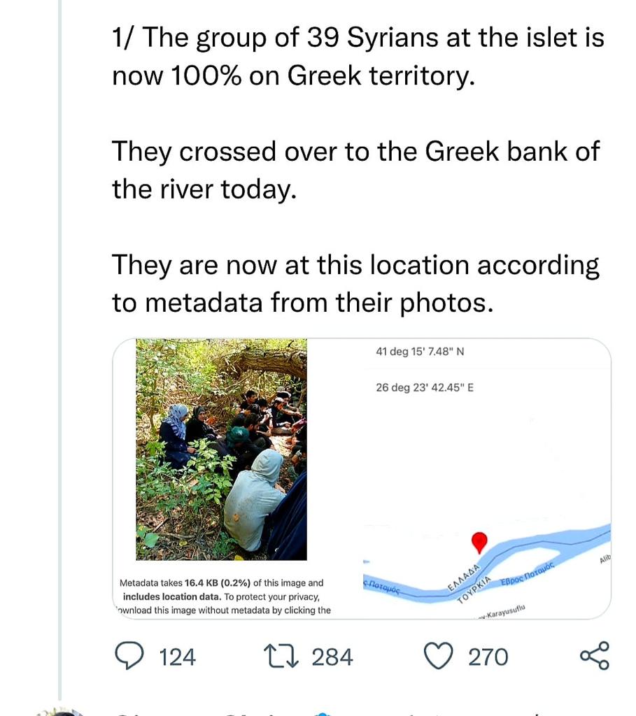 “Από την ανάρτηση προκύπτει ότι τα άτομα είχαν μετακινηθεί από περιοχή εκτός των ελληνικών συνόρων και «τώρα βρίσκονται σε 100% ελληνικό έδαφος. Διέσχισαν τον ποταμό και βρίσκονται στις όχθες της ελληνικής πλευράς” τονίζουν αστυνομικές πηγές.