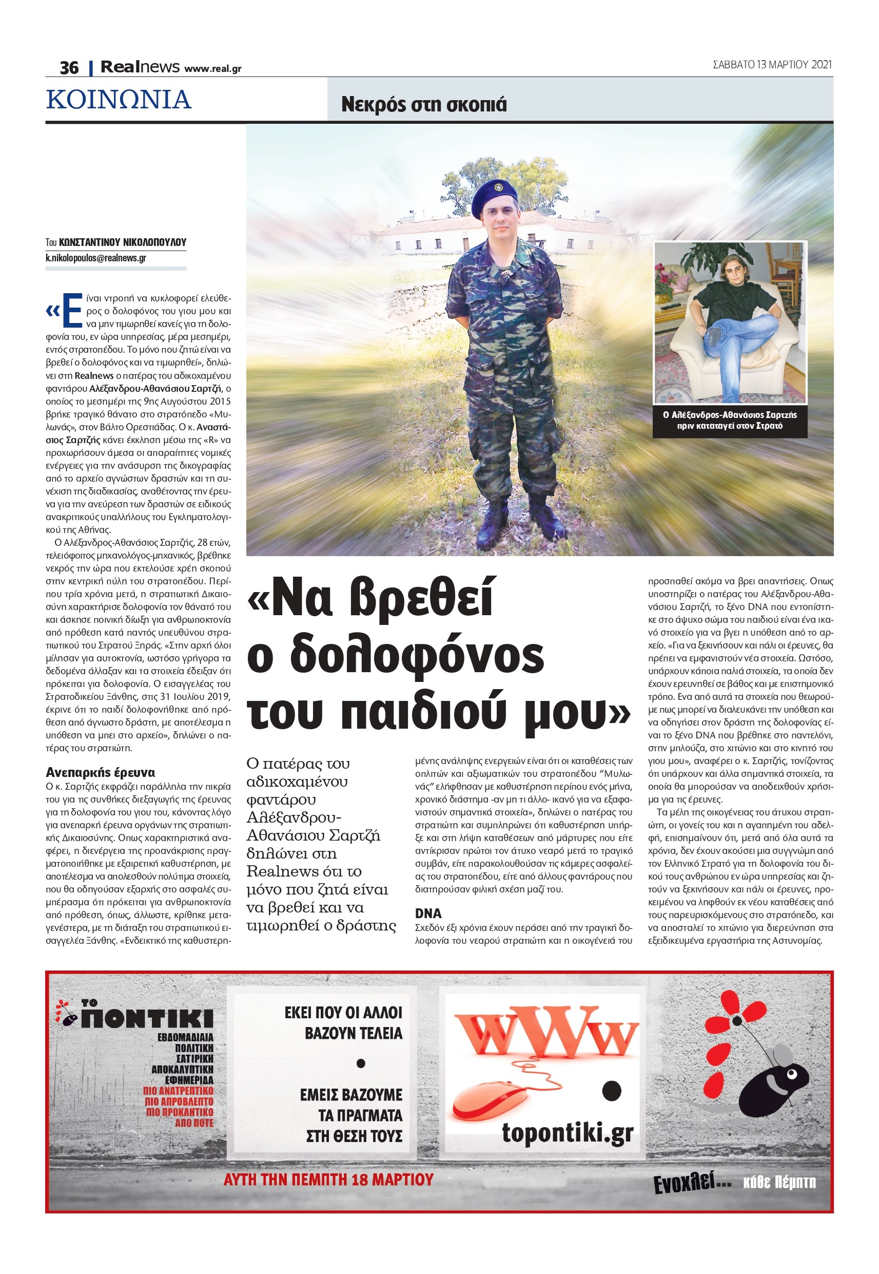 “Eίναι ντροπή να κυκλοφορεί ελεύθερος ο δολοφόνος του γιου μου και να μην τιμωρηθεί κανείς για τη δολοφονία του, εν ώρα υπηρεσίας, μέρα μεσημέρι, εντός στρατοπέδου. Το μόνο που ζητώ είναι να βρεθεί ο δολοφόνος και να τιμωρηθεί”, δηλώνει στη Realnews ο πατέρας του αδικοχαμένου φαντάρου Αλέξανδρου-Αθανάσιου Σαρτζή, ο οποίος το μεσημέρι της 9ης Αυγούστου 2015 βρήκε τραγικό θάνατο στο στρατόπεδο «Μυλωνάς», στον Βάλτο Ορεστιάδας. Ο κ. Αναστάσιος Σαρτζής κάνει έκκληση μέσω της «R» να προχωρήσουν άμεσα οι απαραίτητες νομικές ενέργειες για την ανάσυρση της δικογραφίας από το αρχείο αγνώστων δραστών και τη συνέχιση της διαδικασίας, αναθέτοντας την έρευνα για την ανεύρεση των δραστών σε ειδικούς ανακριτικούς υπαλλήλους του Εγκληματολογικού της Αθήνας.
