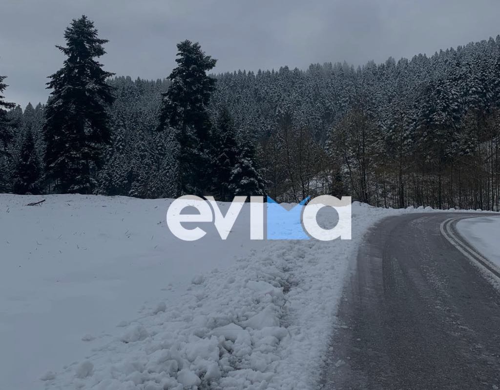 Το ανοιξιάτικο κύμα χιονιά πλήττει και τα ορεινά της Εύβοιας, με αποτέλεσμα αρκετές περιοχές να έχουν ντυθεί στα «λευκά».