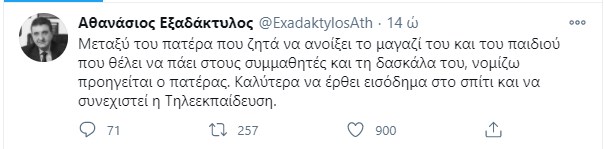 Η ανάρτηση του κ. Εξαδάκτυλου, έχει ως εξής, «Μεταξύ του πατέρα που ζητά να ανοίξει το μαγαζί του και του παιδιού που θέλει να πάει στους συμμαθητές και τη δασκάλα του, νομίζω προηγείται ο πατέρας. Καλύτερα να έρθει εισόδημα στο σπίτι και να συνεχιστεί η τηλεκπαίδευση».