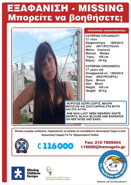 Η 17χρονη Κατερίνα Ιορδανίδου αγνοείται από τις 18 Ιουνίου και την αναζητά η αστυνομία αλλά και το Χαμόγελο του Παιδιού.
