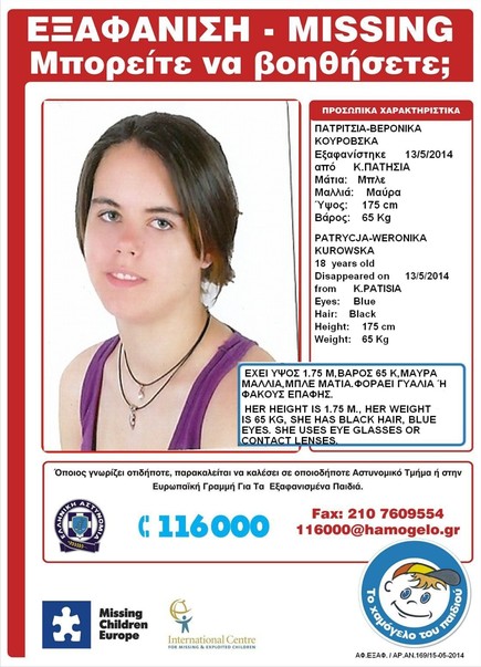 Στις 13/05/2014 το μεσημέρι, εξαφανίστηκε από το σπίτι της στα Κάτω Πατήσια, η Πατρίτσια-Βερόνικα Κουρόβσκα που είναι 17,5 ετών.