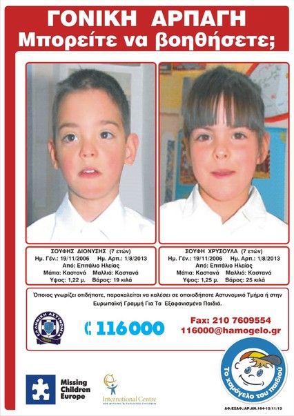 Τα ανήλικα δίδυμα αδέλφια, Χρυσούλα και Διονύσης, 7 ετών, την επιμέλεια των οποίων ασκεί οριστικά πλέον ο πατέρας τους με δικαστική απόφαση, απομακρύνθηκαν από τη μητέρα τους χωρίς νόμιμο δικαίωμα, από το Επιτάλιο Ηλείας, προς άγνωστη διεύθυνση. Ο πατέρας των ανηλίκων αγωνιά για την τύχη τους και ευελπιστεί στη βοήθεια όλων μας για την ανεύρεσή τους. Η Χρυσούλα έχει ύψος 1,25μ και ζυγίζει 27 κιλά. Έχει καστανά μαλλιά και καστανά μάτια. Ο Διονύσης, έχει επίσης καστανά μαλλιά και μάτια. Έχει ύψος 1,22μ και ζυγίζει 19 κιλά.