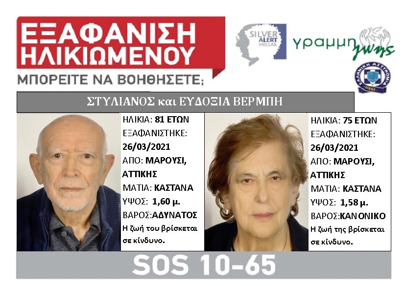 Ο Στυλιανός Βέρμπης 81 ετών και η σύζυγός του Ευδοξία Βέρμπη 75 ετών, την 26/03/21 εξαφανίστηκαν από το σπίτι τους, στο Μαρούσι Αττικής.