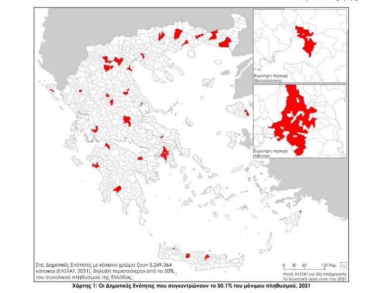 Το φαινόμενο της πληθυσμιακής ανισοκατανομής καταγράφεται ακόμα πιο έντονα όταν αλλάξουμε κλίμακα και εξετάσουμε τις Δημοτικές Ενότητες σημειώνει ο κ. Παππάς, καθώς μόνον 8 από τις υφιστάμενες 1.036 έχουν μόνιμο πληθυσμό που υπερβαίνει τις 100.000 (Αθηναίων, Θεσσαλονίκης, Πατρέων, Πειραιώς, Ηρακλείου, Λαρισαίων, Περιστερίου και Αχαρνών) με τις μισές να βρίσκονται στην Περιφέρεια Αττικής, 66 δε Δημοτικές Ενότητες που βρίσκονται σχεδόν όλες στην Περιφέρεια Αττικής, στην ευρύτερη περιοχή της Θεσσαλονίκης ή αποτελούν ακόμη μέρος των πρωτευουσών αρκετών Περιφερειακών Ενοτήτων συγκεντρώνουν το 50,1% του συνολικού πληθυσμού το 2021 (5,25 εκατομμύρια) στο 4,3% της επιφάνειας. Ταυτόχρονα, το 80% του μόνιμου πληθυσμού μας το 2021 (8,39 εκατομμύρια) συγκεντρώνεται σε 277 Δημοτικές Ενότητες που καλύπτουν το 25,2% της συνολικής έκτασης, ένα ποσοστό που μειώθηκε στο μισό ανάμεσα στο 1951 και το 2021 καθώς στην πρώτη μεταπολεμική απογραφή, 8 στους 10 κατοίκους διέμεναν στο 55,5% της επιφάνειας.