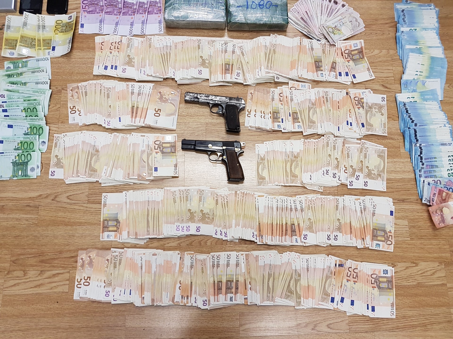 Στις έρευνες που έγιναν βρέθηκαν και κατασχέθηκαν, μεταξύ άλλων, 21 κιλά και 480 γραμμάρια κοκαΐνης, χρηματικό ποσό 92.000 ευρώ, δύο πιστόλια και μία κυνηγετική καραμπίνα.
